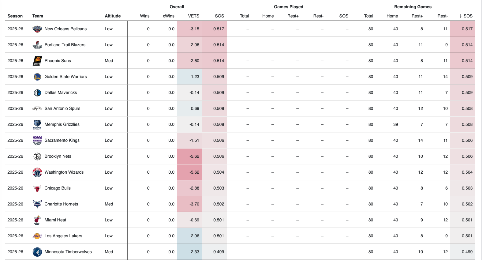 数据网站Positive Residual也更新了社交媒体,根据NBA官方已公布的赛程,统计了联盟各队的赛程难度,评判标准是球队实力、每场比赛前的休息天数、每场比赛的飞行距离、每场比赛的海拔高度,以下是具体排名,按照从困难到容易的顺序排列: