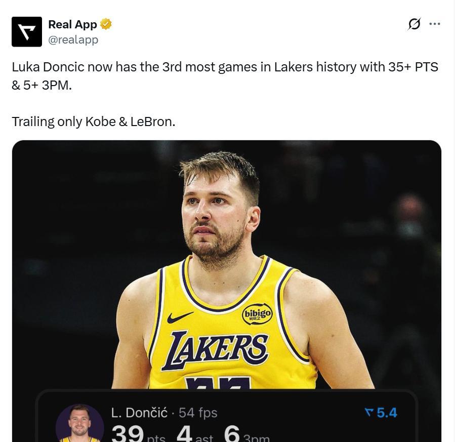 此役,东契奇还创下了神迹。数据显示,这是东契奇第9次轰下至少35分+5记3分,排在湖人队史该项榜单第3,超越了范埃克塞尔(8次)。科比以31次排名第1,詹姆斯以23次排名第2。